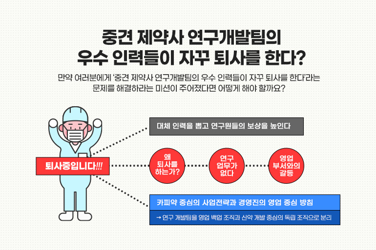 만약 여러분에게 ‘중견 제약사 연구개발팀의 우수 인력들이 자꾸 퇴사를 한다’라는 문제를 해결하라는 미션이 주어졌다면 어떻게 해야 할까요?