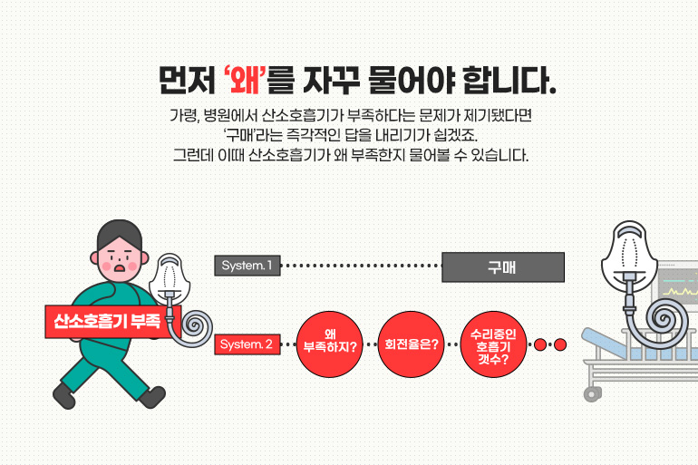 먼저 ‘왜’를 자꾸 물어야 합니다. 가령, 병원에서 산소호흡기가 부족하다는 문제가 제기됐다면 ‘구매’라는 즉각적인 답을 내리기가 쉽겠죠. 그런데 이때 산소호흡기가 왜 부족한지 물어볼 수 있습니다. 회전율은 어떤지, 수리 중인 것은 몇 개인지, 수리에 드는 시간이 너무 긴 것은 아닌지, 중환자용과 간이용이 잘 구분돼서 활용되고 있는지 등을 따져 볼 수 있겠죠. 그렇다면 실제 구비하고 있는 산소호흡기 개수는 적지 않은데 '당장 이용 가능한 수'가 적다는 사실을 확인할 수 있고, 기존 호흡기의 가동률을 높일 방안을 찾는 식으로 문제 해결을 할 수가 있습니다.