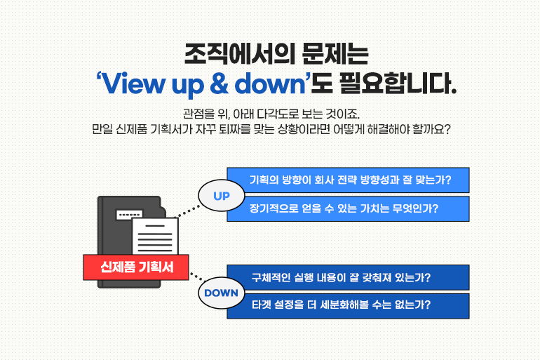 조직에서의 문제는 ‘View up & down’도 필요합니다. 관점을 위, 아래 다각도로 보는 것이죠. 만일 신제품 기획서가 자꾸 퇴짜를 맞는 상황이라면 어떻게 해결해야 할까요? Up 관점을 취한다면, 기획의 방향이 회사 전략 방향성과 잘 맞는지, 장기적으로 얻을 수 있는 가치는 무엇인지 등을 체크해 볼 수 있을 겁니다. Down 관점에서는 구체적인 실행 내용이 잘 갖춰져 있는지, 타겟 설정을 더 세분화해볼 수는 없는지 등을 체크해 봐야 합니다.