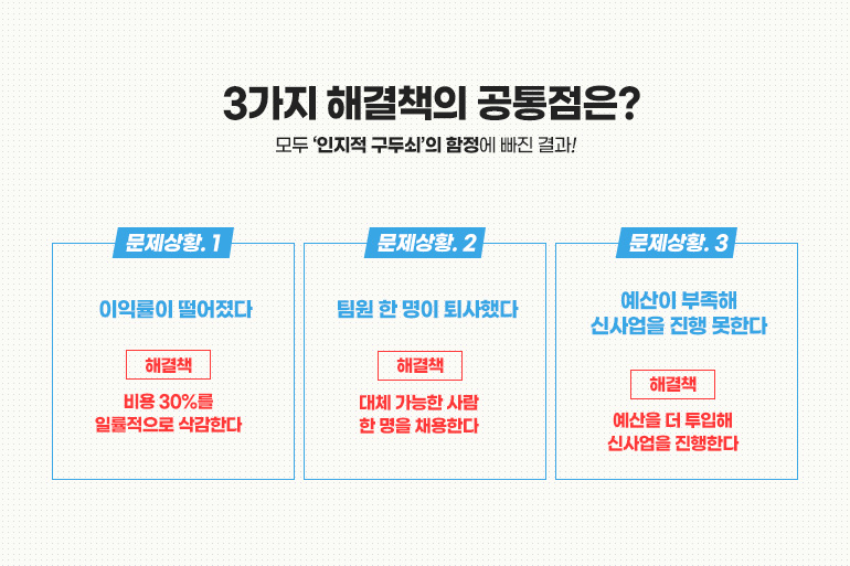 위 3가지 해결책의 공통점은 무엇일까요? 모두 ‘인지적 구두쇠’의 함정에 빠진 결과일 수 있는데요. 무슨 뜻이냐고요?