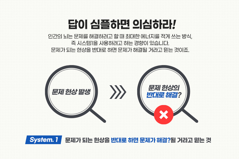 인간의 뇌는 문제를 해결하려고 할 때 최대한 에너지를 적게 쓰는 방식, 즉 시스템1을 사용하려고 하는 경향이 있습니다. 앞선 3가지 경우처럼 문제가 되는 현상을 반대로 하면 문제가 해결될 거라고 믿는 것이죠. 행동경제학자들은 문제 해결력을 키우고 싶다면 ‘답이 심플하면 의심하라’고 조언합니다. 시스템2를 작동시켜야 하는데 시스템1이 작동된 건 아닌지 점검하라는 의미죠. 그렇다면 어떻게 해야 할까요?