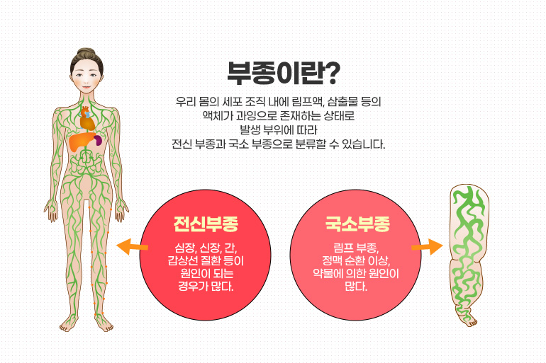 부종은 우리 몸의 세포 조직 내에 림프액이나 삼출물 등의 액체가 고여 과잉으로 존재하는 상태를 의미합니다. 발생 부위에 따라 전신 부종과 국소 부종으로 분류할 수 있으며, 질병과 관련된 것인지 생리적인 것인지도로 나눌 수 있습니다.