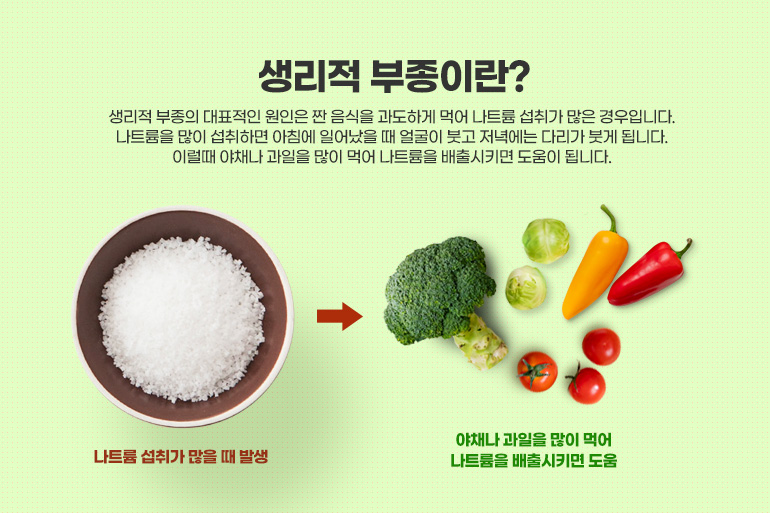 지금까지 부종의 원인에 5가지에 대해 살펴보았습니다. 하지만 위에서 설명한 질환이 없는데도 붓는 경우가 있습니다. 이러한 것은 흔히 생리적 부종이라고 합니다. 생리적 부종의 대표적인 원인은 짠 음식을 과도하게 먹어 나트륨 섭취가 많은 경우입니다. 나트륨을 많이 섭취하면 아침에 일어났을 때 얼굴이 붓고 저녁에는 다리가 붓게 됩니다. 이럴때 야채나 과일을 많이 먹어 나트륨을 배출시키면 도움이 됩니다.