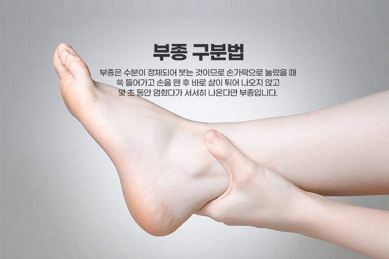 간혹, 어떤 경우에는 살이 찐 것인지 부종인 건지 잘 모를 때도 있습니다. 부종인지 살이 찐 것인지를 구분하는 방법은 엄지손가락으로 발등이나 정강이뼈 부위를 꾹 눌러 보는 것입니다. 부종은 수분이 정체되어 붓는 것이므로 손가락으로 눌렀을 때 쑥 들어가고 손을 뗀 후 바로 살이 튀어 나오지 않고 몇 초 동안 멈췄다가 서서히 나온다면 부종입니다. 만약에 살이 찐 거라면 잘 안 들어가거나 들어간다 하더라도 쑥 들어갔다 바로 튀어나오게 됩니다.