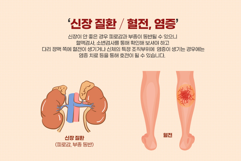 네 번째 신장 질환에 의한 부종이 있습니다. 신장이 안 좋은 경우 피로감과 부종이 동반될 수 있으니 혈액검사, 소변검사를 통해 확인해 보셔야 합니다. 다섯 번째는 다리 정맥 쪽에 혈전이 생기거나 신체의 특정 조직부위에 염증이 생기는 경우에도 부종이 생길 수 있습니다. 이런 경우에는 염증 치료 등을 통해 호전이 될 수 있습니다.