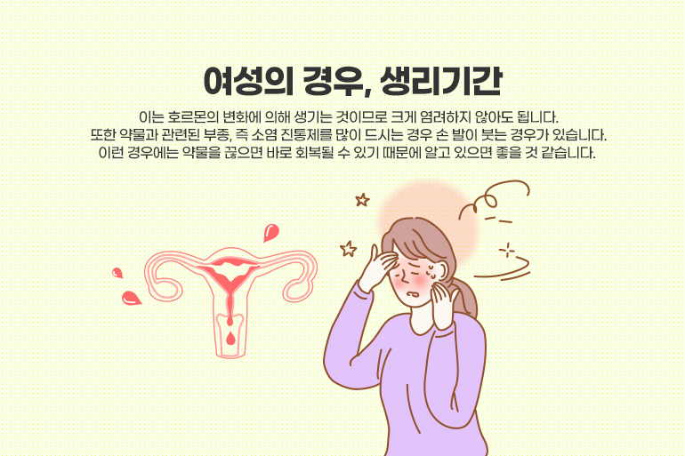 이 외에도 여성의 경우 생리기간에 주기적으로 부종이 생길 수 있는데, 이는 호르몬의 변화에 의해 생기는 것이므로 크게 염려하지 않아도 됩니다. 또한 약물과 관련된 부종, 즉 소염 진통제를 많이 드시는 경우 손 발이 붓는 경우가 있습니다. 이런 경우에는 약물을 끊으면 바로 회복될 수 있기 때문에 알고 있으면 좋을 것 같습니다.