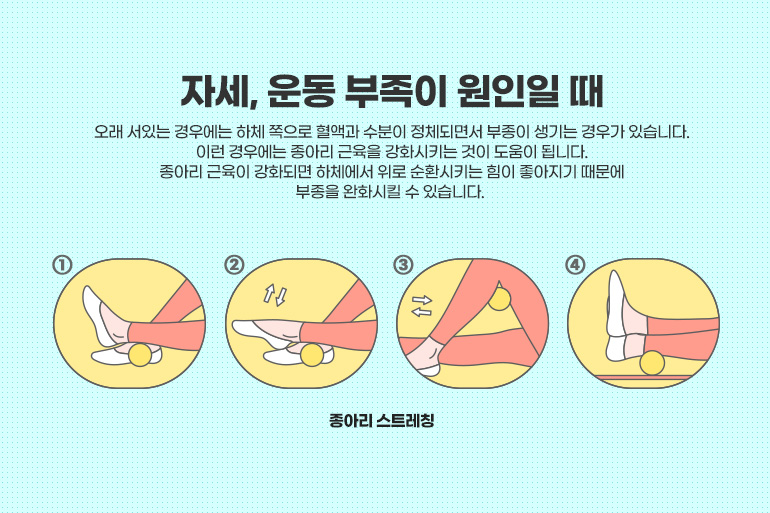 자세가 좋지 않거나 운동 부족으로도 생리적인 부종이 생깁니다. 특히 오래 서있는 경우에는 하체 쪽으로 혈액과 수분이 정체되면서 부종이 생기는 경우가 있습니다. 이런 경우에는 종아리 근육을 강화시키는 것이 도움이 됩니다. 종아리 근육이 강화되면 하체에서 위로 순환시키는 힘이 좋아지기 때문에 부종을 완화시킬 수 있습니다.