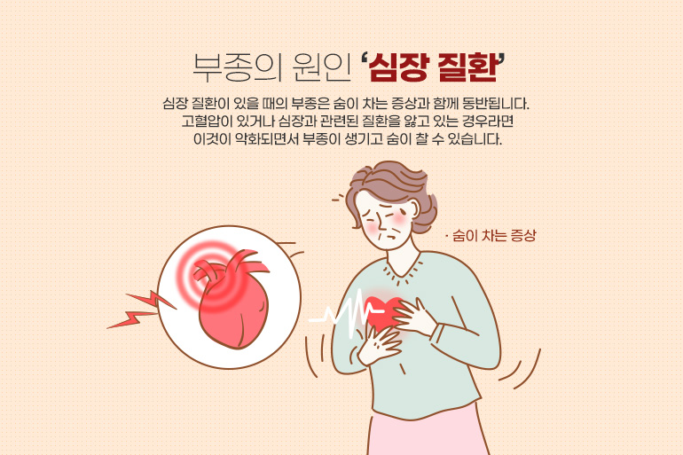 두 번째는 심장 질환에 의한 부종입니다. 심장 질환이 있을 때의 부종은 숨이 차는 증상과 함께 동반됩니다. 고혈압이 있거나 심장과 관련된 질환을 앓고 있는 경우라면 이것이 악화되면서 부종이 생기고 숨이 찰 수 있습니다. 이런 경우 반드시 내과에 가서 심장검사를 받아보시는 것이 좋습니다.