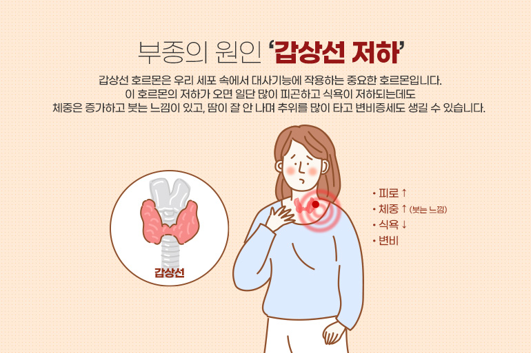 부종의 대표적인 원인으로 첫 번째는 갑상선 기능 저하증입니다. 갑상선 기능 저하증의 경우 부종과 함께 특징적인 증상들을 같이 나타나는데요. 피로감이 심해지는 증세가 있다면 갑상선 기능 저하증을 의심해봐야합니다. 갑상선 호르몬은 우리 세포 속에서 대사기능에 작용하는 중요한 호르몬입니다. 이 호르몬의 저하가 오면 일단 많이 피곤하고 식욕이 저하되는데도 체중은 증가하고 붓는 느낌이 있고, 땀이 잘 안 나며 추위를 많이 타고 변비증세도 생길 수 있습니다. 이런 증세가 있다면 병원에서 혈액검사를 통해 확인해 볼 수 있으니 꼭 검사를 받아보시는 것이 좋습니다.