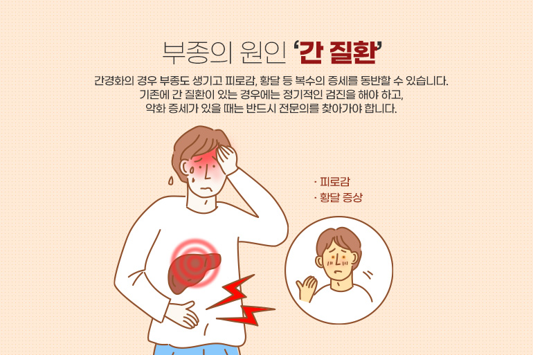 세 번째 간 질환에 의한 부종이 있습니다. 특히 간경화의 경우 부종도 생기고 피로감, 황달 등 복수의 증세를 동반할 수 있습니다. 기존에 간 질환이 있는 경우에는 정기적인 검진을 해야 하고, 악화 증세가 있을 때는 반드시 전문의를 찾아가야 합니다.