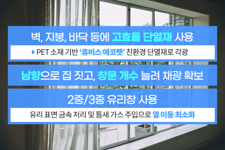 이를 위해 주택의 벽, 지붕, 바닥 등에 고효율 단열재를 주로 사용하죠. 휴비스에서 개발한 PET 소재 기반의 ‘에코펫’ 역시 단열성, 경량성, 완충성이 뛰어나 친환경 주택의 단열재로 각광받고 있답니다. 또한 집을 남향으로 짓고, 창을 많이 내 햇빛이 집안 깊은 곳까지 들어오게 해요. 대신 2중 또는 3중 유리창을 주로 이용하며, 표면에 금속을 씌우거나 창 사이에 열의 이동을 막는 가스를 주입해 열의 이동을 최소화하죠.