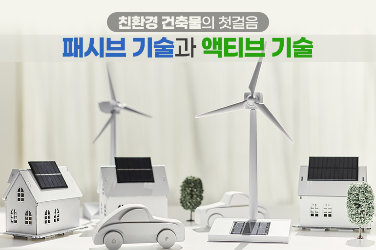 ‘제로 에너지 주택’이라고 하면 에너지를 쓰지 않는 주택이라고 오해하기 쉬운데요. 에너지 사용량과 에너지 생산량을 합해 제로(0)가 되는 주택을 ‘제로 에너지 주택’이라고 해요. ‘제로 에너지 주택’을 실현하기 위해선 건물의 단열성과 기밀성을 높여 에너지 소비를 최소화하는 ‘패시브(Passive) 기술’이 필수죠. 여기에 태양열, 풍력, 지열 등의 자연 에너지를 이용해 에너지를 스스로 만드는 ‘액티브(Active) 기술’이 더해지면 제로 에너지 주택이 실현된답니다.