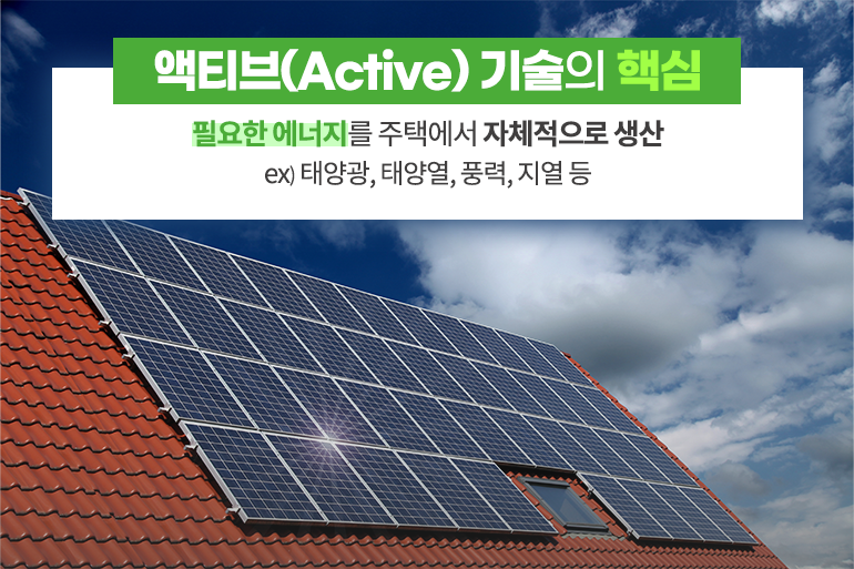 ‘액티브(Active) 기술’은 일상에 필요한 에너지를 주택에서 자체적으로 생산하는 것을 의미하는데요. 주로 지붕이나 마당 등에 반사경이나 태양 전지 등을 설치해 태양광 에너지를 생산하며, 이를 전기 에너지로 활용하죠. 최근에는 건물 외벽 마감재 대신 태양광 설비를 설치해 설치 면적을 넓히기도 한답니다.