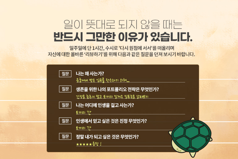 일주일을 시간으로 환산하면 168시간입니다. 일주일이란 시간은 누구에게나 똑같이 주어집니다. 이번 주말 당신에게 주어진 168시간 중 1시간만 투자해서 ‘리뷰하기’를 해보셨으면 합니다. 잠시 투자한 그 1시간이 소중하게 작용하여 당신의 삶을 완전히 바꿀 수 있습니다. 인생은 생방송입니다. 이 방송에서 당신은 조연이 아니라 주연입니다. 올 한 해가 가기 전에 당신을 멋지게 연출하시기 바랍니다. 그 어느 때보다 열심히 살아오신 당신을 진심으로 응원합니다. 바쁘시더라도 원점에 한 번 서보시기 바랍니다.