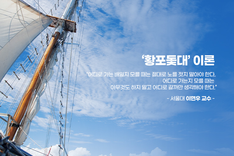 서울대 이면우 교수가 주장하는 일명 '황포돛대' 이론입니다. 목표를 정할 때는 속도보다 ‘방향’을 중요하게 챙겨야 합니다. ‘방향’이 정확하면 어떻게든 가기 마련이므로 ‘방향’에 맞춰 자신을 제대로 ‘리뷰하기’만 하면 된다는 것이죠.