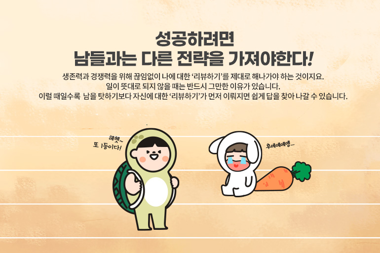 이 이야기에서 우리는 성공하려면 남들과 다른 전략을 가져야 한다는 것을 알 수 있습니다. 생존력과 경쟁력을 위해 끊임없이 나에 대한 ‘리뷰하기’를 제대로 해나가야 하는 것이지요.