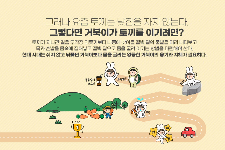 그러나 요즘 토끼는 낮잠을 자지 않는다. 그렇다면 거북이가 토끼를 이기려면 어떻게 해야 할까? 토끼가 지나간 길을 무작정 뒤쫓기보다 나중에 찾아올 절벽 밑의 풀밭을 미리 내다보고 목과 손발을 몸속에 집어넣고 절벽 밑으로 몸을 굴려 이기는 방법을 마련해야 한다. 현대 시대는 쉬지 않고 뒤쫓던 거북이보다 몸을 굴리는 엉뚱한 거북이의 용기와 지혜가 필요하다.”