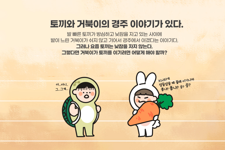 "토끼와 거북이의 경주 이야기가 있다. 발 빠른 토끼가 방심하고 낮잠을 자고 있는 사이에 발이 느린 거북이가 쉬지 않고 기어서 경주에서 이겼다는 이야기다.