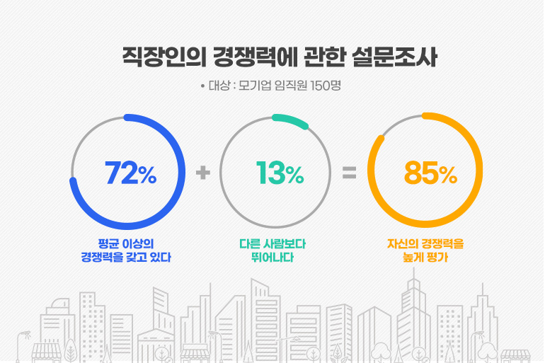 국내 여론조사 기관에서 모기업 임직원 150명을 대상으로 직장인의 경쟁력에 관해 설문조사를 했습니다. 응답자의 72%가 본인이 ‘평균 이상의 경쟁력을 갖고 있다.’고 답했고, 13%는 ‘다른 사람보다 뛰어나다.’고 답했다고 합니다. 즉 85%가 자신의 경쟁력을 높게 평가하는 것으로 나타났습니다.