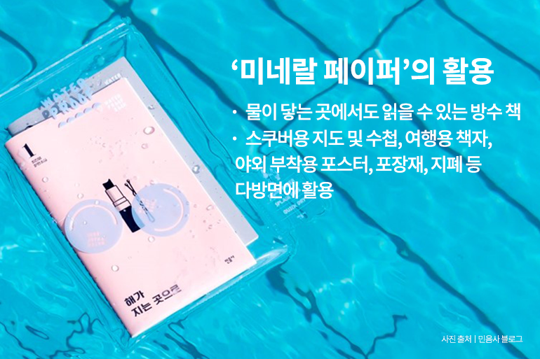 미네랄 페이퍼는 일반 종이로 만드는 제품이라면 무엇이든 대체가 가능하죠. 미네랄 페이퍼로 제작한 책은 해변, 수영장, 욕조 등 물이 닿는 곳에서도 마음 편히 읽을 수 있어 인기가 높아요. 국내 출판사 ‘민음사’에서도 미네랄 페이퍼를 습기에 약한 본드 대신 실 제본으로 엮어 방수 및 내구성을 강화한 책을 꾸준히 출판하고 있답니다.
