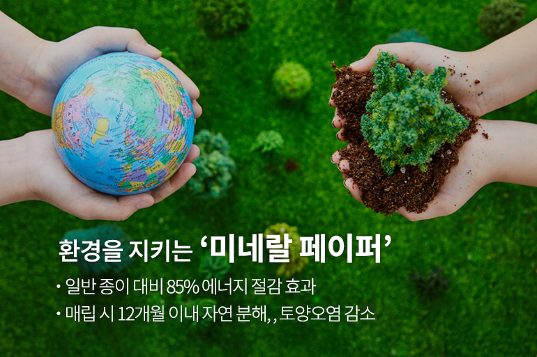 ‘미네랄 페이퍼’는 나무를 사용하지 않아 삼림 파괴를 막을 수 있어요. 또한 목재 펄프는 원료를 섞기 위해 많은 양의 물이 필요하지만 ‘미네랄 페이퍼’는 물 절약에도 도움이 되죠. 또한 돌가루에서 천연 백색 원료를 얻을 수 있어 표백 과정을 생략할 수 있어요. 이렇게 제조공정이 단축되면서 일반 종이 대비 85%의 에너지 절감 효과가 있답니다.