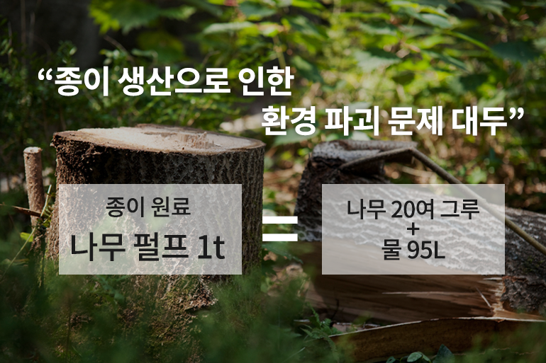 지난해 우리나라에서 사용한 인쇄용지는 무려 166만여 톤으로 이를 환산하면 매일 나무 8만 그루, 물 42만리터를 사용한 셈인데요. 실제로 종이의 원료가 되는 나무 펄프 1톤을 생산하기 위해서 20년 이상이 된 큰 나무 20여 그루와 물 95L가 필요하다고 하니 종이로 인한 환경파괴가 심각한 수준이죠.