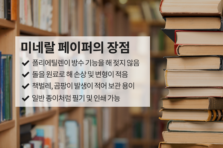 폴리에틸렌이 방수 기능을 해 물에 젖지 않고, 돌이 원료이기 때문에 쉽게 변형되거나 찢어지지 않는 것이 미네랄 페이퍼의 가장 큰 장점이에요. 또한 장기간 보관하면 곰팡이나 책벌레가 생기는 일반 종이책과 달리 벌레가 생기지 않아 보관이나 관리가 용이하죠. 게다가 종이의 원료나 성질은 달라도 일반 종이처럼 필기 및 인쇄가 가능하기 때문에 활용도가 매우 높답니다.