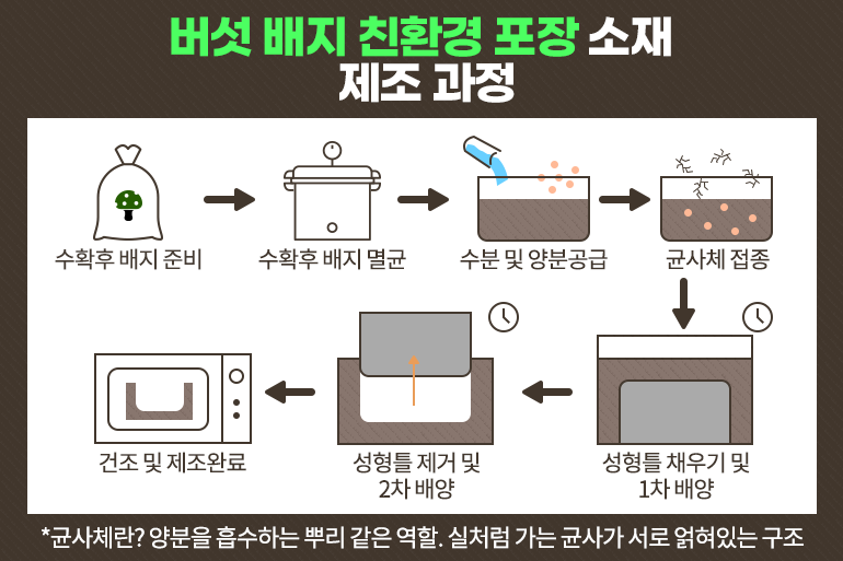 다양한 종류만큼이나 다양한 조리법으로 우리의 입을 즐겁게 하는 버섯! 버섯을 재배하기 위해서는 영양을 공급하는 배지가 반드시 필요한데요. 하지만 버섯을 수확하고 남은 배지는 활용 방법이 마땅치 않아 대부분 폐기물로 버려져 왔어요. 그런데 최근 버섯 배지를 친환경 포장재로 만드는 기술이 국내에서 개발되었다고 해요. 그렇다면 버섯 배지의 재탄생, 자세히 알아볼까요?