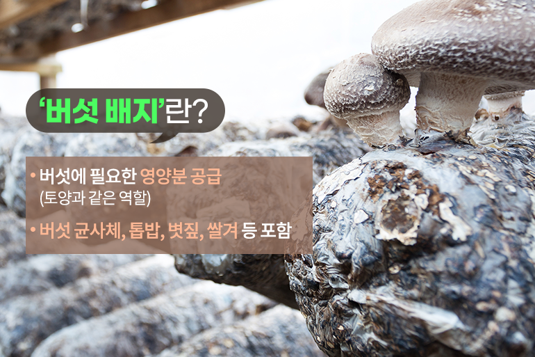 ‘배지’란 식물을 재배할 때 필요한 영양분을 액체 또는 고체화한 것으로, 버섯을 키울 때도 배지가 토양과 같은 중요한 역할을 하죠. 버섯 배지에는 버섯 균사체, 톱밥, 볏짚, 쌀겨 등이 포함되어 있는데요.
