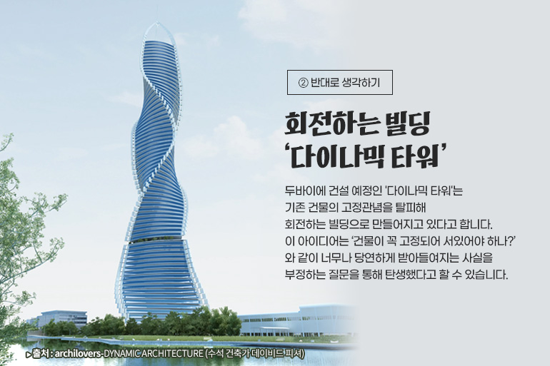 건물을 짓는데 한 쪽은 멋들어진 오션뷰이고 반대 쪽은 별볼일 없는 뷰라고 한다면 건물의 가치를 제대로 못 살리게 될 텐데요. 두바이에 건설 예정인 '다이나믹 타워'는 기존 건물의 고정관념을 탈피해 회전하는 빌딩으로 만들어지고 있다고 합니다. 이 아이디어는 ‘건물이 꼭 고정되어 서있어야 하나?’와 같이 너무나 당연하게 받아들여지는 사실을 부정하는 질문을 통해 탄생했다고 할 수 있습니다.
