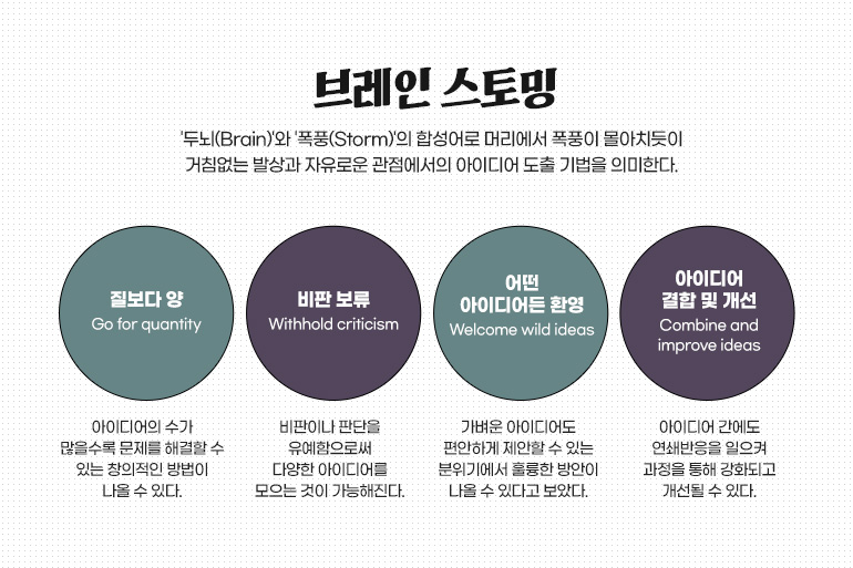 고정관념을 깨는 발상은 그저 이뤄지지 않습니다. 전혀 어울릴 것 같지 않은 이질적인 것을 붙여도 보고, 또 너무나 당연한 현실을 부정해보기도 하는 등 의도적인 노력이 반드시 필요하겠습니다.
