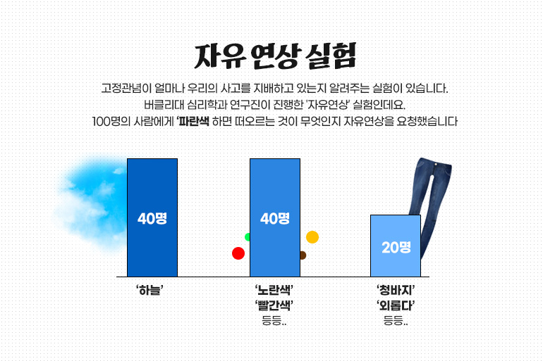 고정관념이 얼마나 우리의 사고를 지배하고 있는지 알려주는 실험이 있습니다. 버클리대 심리학과 연구진이 진행한 '자유연상' 실험인데요. 이들은 100명의 사람에게 ‘파란색 하면 떠오르는 것이 무엇인지 자유연상을 요청했습니다. 그랬더니 40명은 ‘하늘’이라고 답했고 또 40명은 노란색, 빨간색 등 색깔을 얘기했습니다. 분명 자유연상이라고 했는데 ‘관습적인 연상’에서 못 벗어난 거죠. ‘청바지’나 ‘외롭다’와 같이 평범함을 넘어서는 답을 말한 사람은 불과 20%밖에 되지 않았다고 합니다.