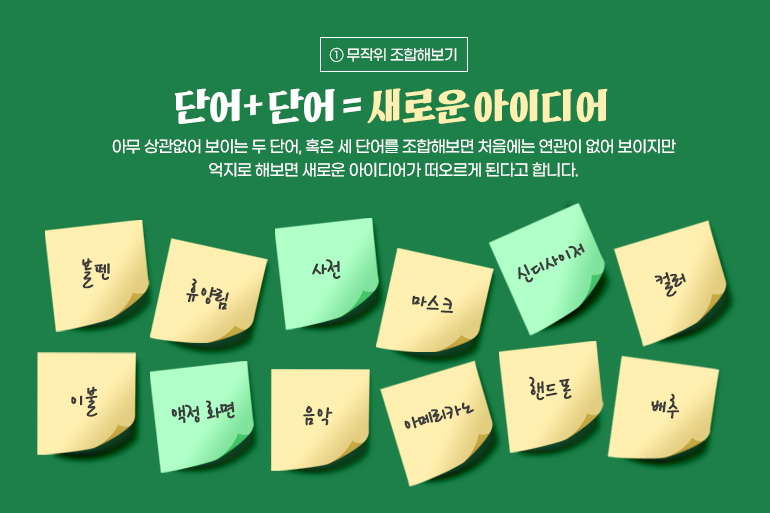 소프트뱅크 손정의 회장은 아이디어 발상을 위해 무작위 조합을 매일 했다고 하는데요. 단어 카드를 수 백장 만들어 통 속에 넣고 3개씩 제비 뽑기를 한 거죠. 아무 상관없어 보이는 두 단어, 혹은 세 단어를 조합해보면 처음에는 연관이 없어 보이지만 억지로 해보면 새로운 아이디어가 떠오르게 된다고 합니다. 손 회장은 대학시절 ‘신디사이저+사전+액정 화면’의 조합으로 음성 전자사전 아이디어를 냈고 샤프사에 매각해 큰 돈을 벌었죠.