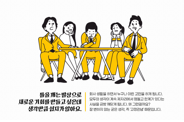 회사 생활을 하면서 누구나 이런 고민을 하게 됩니다. 맞닥뜨린 문제를 잘 풀어내고 싶은데 기존의 방법으로는 마음에 드는 결과가 나올 것 같지 않은 상황에서 말이죠. 그래서 여럿이 모여 브레인스토밍을 하게 됩니다. 어떤 아이디어든 좋으니까 자유롭게 상상해보자고 하는 거죠. 그런데 모두의 생각이 계속 제자리에서 맴돌고 한계가 있다는 사실을 금방 깨닫게 됩니다. 왜 그런걸까요? 잘 변하지 않는 굳은 생각, 즉 '고정관념' 때문입니다.