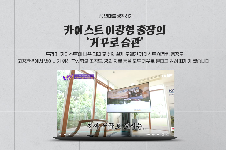 또한 드라마 '카이스트'에 나온 괴짜 교수의 실제 모델인 카이스트 이광형 총장도 일상에서 ‘반대로 생각하기’를 습관화했다고 합니다. 그는 고정관념에서 벗어나기 위해 TV, 학교 조직도, 강의 자료 등을 모두 거꾸로 본다고 밝혀 화제가 됐습니다.