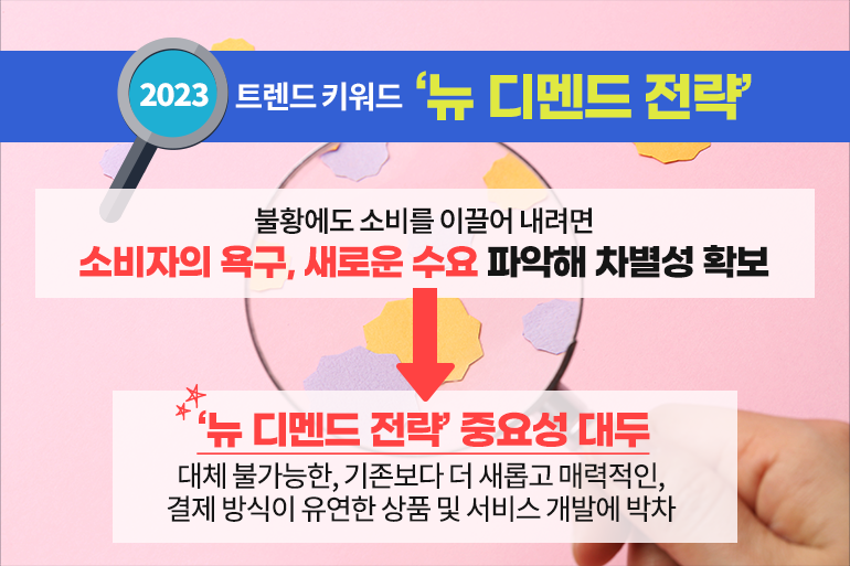 따라서 2023년에는 ‘뉴 디멘드 전략’의 중요성이 커지게 될 거예요. 기업들은 사지 않고는 못 배기는 대체 불가능한 상품, 기존에도 사용했지만 더 새롭고 매력적인 상품, 결제 방식이 유연한 상품 등 차별화된 상품 및 서비스 개발을 위한 전략을 세우는데 박차를 가해야 한답니다.