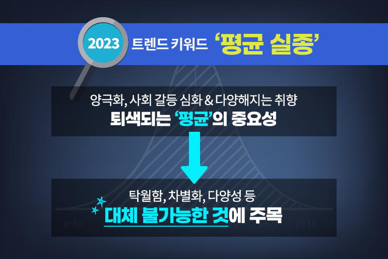 그동안 우리는 ‘평균’에 포함될 때 안정감을 느끼고, 기업들 역시 다수가 선호하는 것에 기준을 맞춰왔죠. 하지만 해가 거듭될수록 양극화와 사회 갈등이 심화되고, 취향이 다양해지면서 중간 혹은 보통으로 불리는 ‘평균’의 개념이 희박해져요. 따라서 무난하고, 평범한 것들은 점차 선택받기 어려워지죠. 따라서 개인과 기업은 탁월함, 차별화, 다양성 등의 대체 불가능한 것에 더욱 주목해야 한답니다.