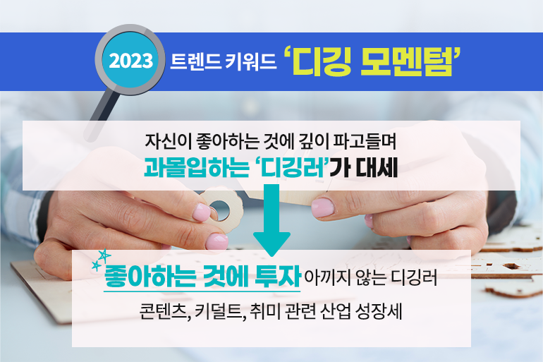 과거에는 다방면에 관심을 갖는 사람들을 트렌디하다고 평가해왔죠. 하지만 이제는 자신이 좋아하는 분야를 깊이 있게 파고들면서 ‘과몰입’하는 것을 즐기는 ‘디깅러’들이 대세가 될 거예요. 자신의 취향에 맞는 분야에는 아낌없이 시간과 돈을 쓰는 디깅러들이 늘면서 콘텐츠, 키덜트, 취미 관련 산업은 성장할 전망이죠.