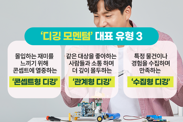 참고로 ‘디깅 모멘텀’에는 대표적인 3가지 유형이 있는데요. 몰입하는 재미를 느끼기 위해 콘셉트에 열중하는 ‘콘셉트형 디깅’, 같은 대상을 좋아하는 사람들과 소통하며 더 깊이 몰두하는 ‘관계형 디깅’, 특정 물건이나 경험을 수집하며 만족하는 ‘수집형 디깅’이 있답니다.