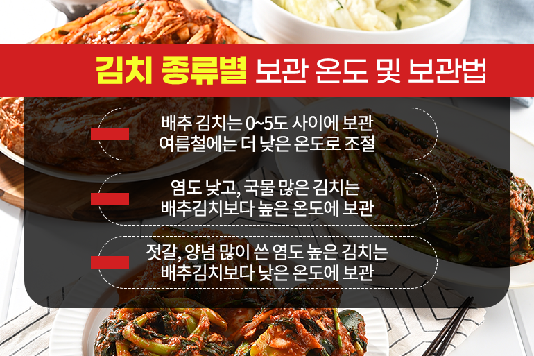 배추김치의 경우 0~5도에 보관하는 것이 가장 좋으며, 여름철 온도가 높아지면 김치냉장고 온도를 조금 더 낮춰야 해요. 대신 동치미, 백김치처럼 염도가 낮고, 국물이 많은 김치는 배추김치보다 조금 높은 온도에 보관하고, 젓갈이나 양념이 많이 들어가 염도가 높은 김치는 좀 더 낮은 온도에 보관하는 것이 적합하죠.