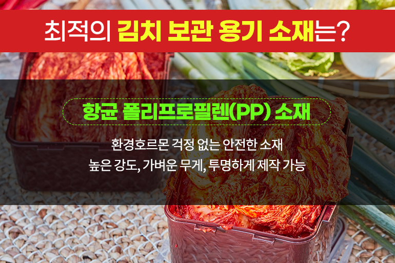 국내 연구팀에서 항균 처리된 폴리프로필렌, 일반 폴리프로필렌, 스테인리스, 도자기 용기에 50일간 각각 김치를 보관한 후 특성을 분석한 결과, 항균 처리된 폴리프로필렌 용기가 가장 오랫동안 김치의 품질과 아삭한 식감을 유지했으며, 비타민 C 보전율도 매우 높게 나타났다고 해요.