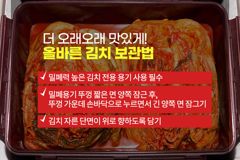 맛있게 담근 김치를 오랫동안 맛있게 즐기기 위해선 올바른 김치 보관법을 지키는 것이 중요해요. 우선 김치를 보관할 때는 공기와의 접촉을 최소화하는 것이 관건이죠. 따라서 밀폐력이 좋은 김치 전용 용기 사용은 필수! 또한 직사각형 용기를 사용할 때는 짧은 면의 양쪽을 잠근 후 뚜껑 가운데를 손바닥으로 누르면서 긴 양쪽면을 잠그면 공기 유입을 차단할 수 있어요.