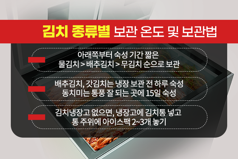 김치를 냉장고에 넣을 때는 냉기가 고르게 유지되는 아래쪽부터 숙성 기간이 짧은 물김치, 배추김치, 무김치 순으로 보관하는 것이 좋아요. 또한 배추김치, 갓김치는 냉장고에 보관하기 전, 맛을 들이기 위해 하루정도 숙성을 해주면 유산균이 충분히 생성되어 곰팡이가 생기는 걸 막을 수 있어요. 단, 동치미는 통풍이 잘 되는 곳에서 보름 정도 숙성 후에 냉장 보관해 주세요. 만약 김치냉장고가 없다면 냉장고에 김치통을 넣고 통 주위에 아이스팩 2~3개를 놓아두면 비슷한 효과를 얻을 수 있답니다.