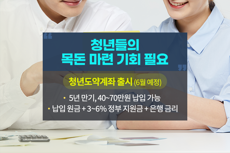 올 6월 출시를 앞두고 있는 ‘청년도약계좌’는 청년들이 중장기적으로 자산을 형성해 목돈을 마련할 수 있도록 지원하는 정책이에요. 5년 만기로 매달 40만원에서 70만 원까지 납입이 가능하며, 5년간 70만 원씩 납입을 완료하면 정부의 지원이 더해져 5천만 원이 만들어져요. 소득에 따라 3~6%의 정부 지원금을 받기 때문에 만기 시 받게 될 금액은 조금씩 다를 수 있죠. 여기에 은행 금리도 더해지게 되는데 상품 출시 시점의 금리가 기준이 될 예정이에요.