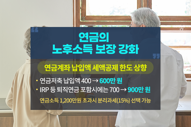 많은 직장인들이 다양한 노후 대비책을 마련하고 계실 텐데요. 새해부터는 개인, 퇴직연금의 노후소득 보장을 강화하기 위해 연금계좌 납입액 세액공제 한도가 200만원 상향돼요. 기존에는 연금저축 납입액은 400만 원, IRP 등 퇴직연금 포함 시에는 700만 원까지 세액이 공제되었으나 앞으로는 각각 600만 원, 900만 원까지 세액이 공제된답니다. 또한 이전에는 연금소득이 1,200만 원을 초과하는 경우 다른 소득과 합산해 종합과세를 했지만 새해부터 분리과세(15%)를 선택할 수 있죠.