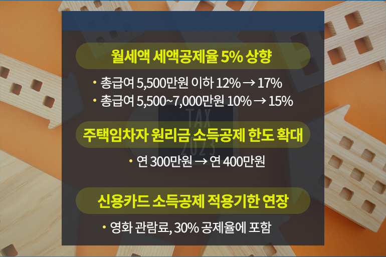 또한 무주택자들의 주거비 부담을 줄이기 위해 무주택 세대주가 납입하는 월세액에 대한 세액공제율이 5% 상향된답니다. 총급여 5,500만 원 이하는 12%에서 17%로, 총 급여 5,500~7,000만 원은 10%에서 15%로 상향된 공제율을 적용받게 되죠. 주택임차자금(전세금 또는 월세보증금) 원리금 상환액 소득공제 한도 역시 연 300만 원에서 400만 원으로 확대되었어요.