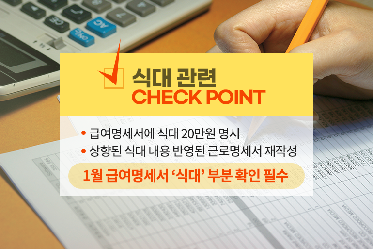 따라서 식대 상향에 관한 내용이 반영된 근로 계약서를 다시 작성하고, 변경된 급여 내용을 임금명세서에 반영해야 해요. 1월 급여 명세서를 받으셨다면 급여명세서에 식대가 20만원으로 상향되었는지 꼭 확인해 보시길 바라요!