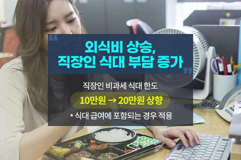 매일 회사에서 점심을 사 먹는 직장인들은 외식 물가가 올라 식대 부담이 매우 커졌죠. 새해부터는 직장인의 식대 비과세 한도가 기존 10만 원에서 20만 원으로 상향 조정되었어요. 식대가 급여에 포함되는 경우 적용되며, 급여명세서에 식대 20만 원이 명시되는 것이 원칙이에요.