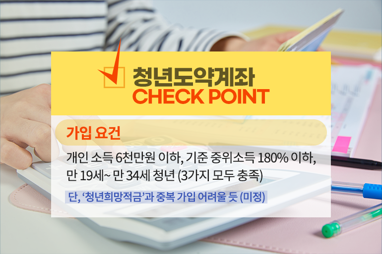 개인 소득이 6천만원 이하이면서 기준 중위소득이 180% 이하인 만 19세에서 만 34세의 청년이라면 누구나 상품 가입이 가능하죠. 다만 이전에 출시된 ‘청년희망적금’과는 중복 가입이 불가능할 것으로 보이는데요. 현재 미정이지만 동시 가입은 현실적으로 납입이 부담스럽긴 하죠. 따라서 청년희망적금을 들고 있는 직장인은 청년도약계좌 상품이 출시되면 두 가지를 꼼꼼히 비교해 보고 더 유리한 상품을 선택은 것을 추천해요.