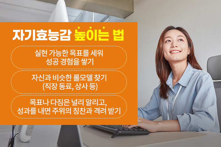 자기효능감은 타고난 성격이나 자라온 환경에 의해서도 영향을 받지만 꾸준한 노력을 통해 충분히 키워나갈 수 있는데요. 우선 실현 가능한 목표를 세워 성공 경험을 쌓아가는 것을 추천해요. 작은 성공 경험이 반복되면 자신감이 생기고, 혹 실패하더라도 과정이 주는 성취감이 자기효능감을 키우는 데 도움이 되죠.